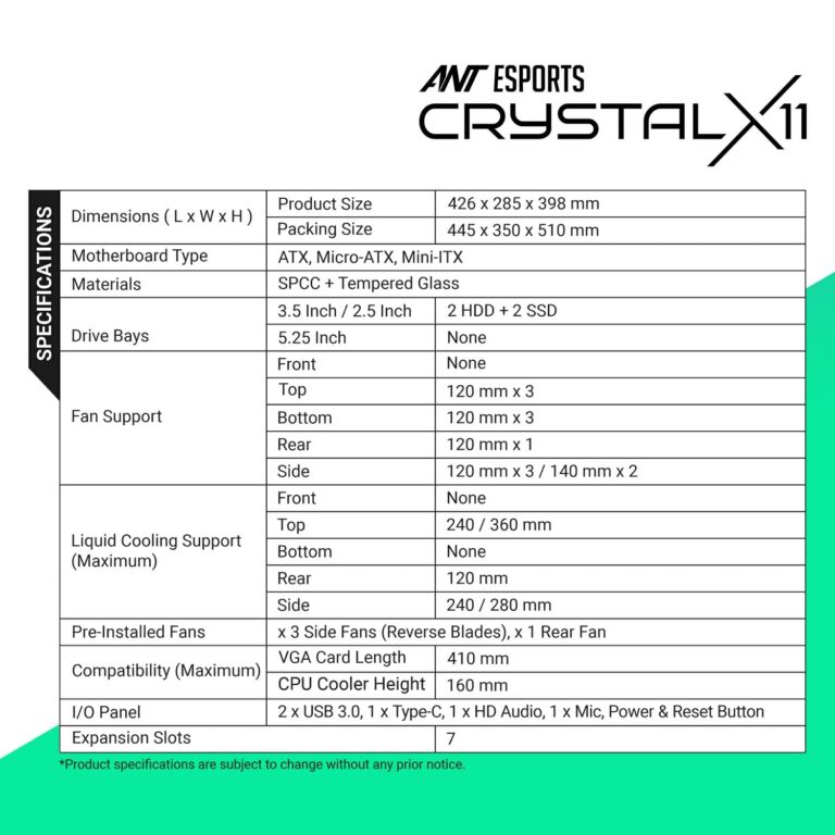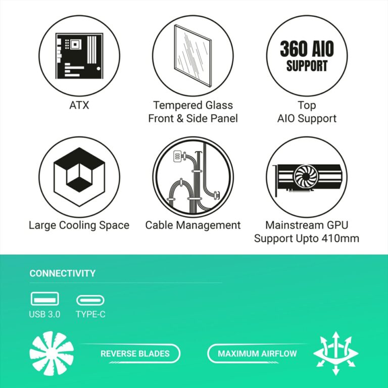 • Fan Support : 3 x 120 mm Top, 3 x 120 mm Bottom, 1 x 120 mm Rear, 3 x 120 mm / 2 x 140 mm Side ; Pre-Installed : 1 x 120mm ARGB Rear Fan (Normal Blades) and 3 x 120mm ARGB Side Fans (Reverse Blades)